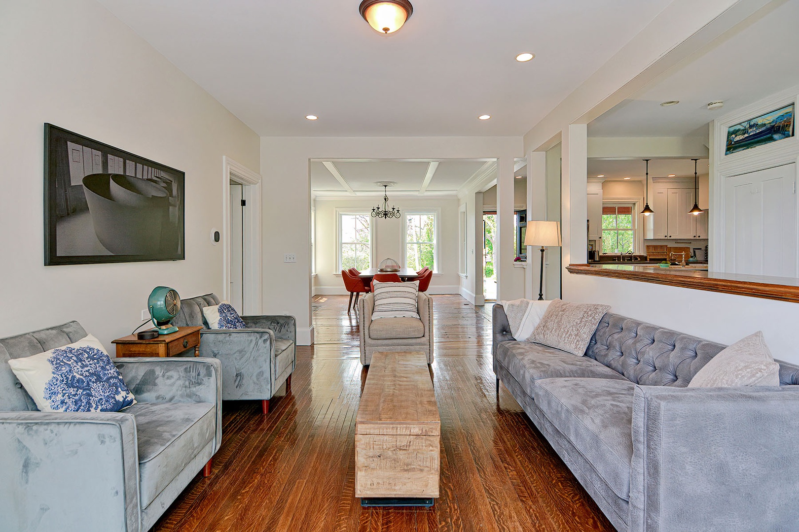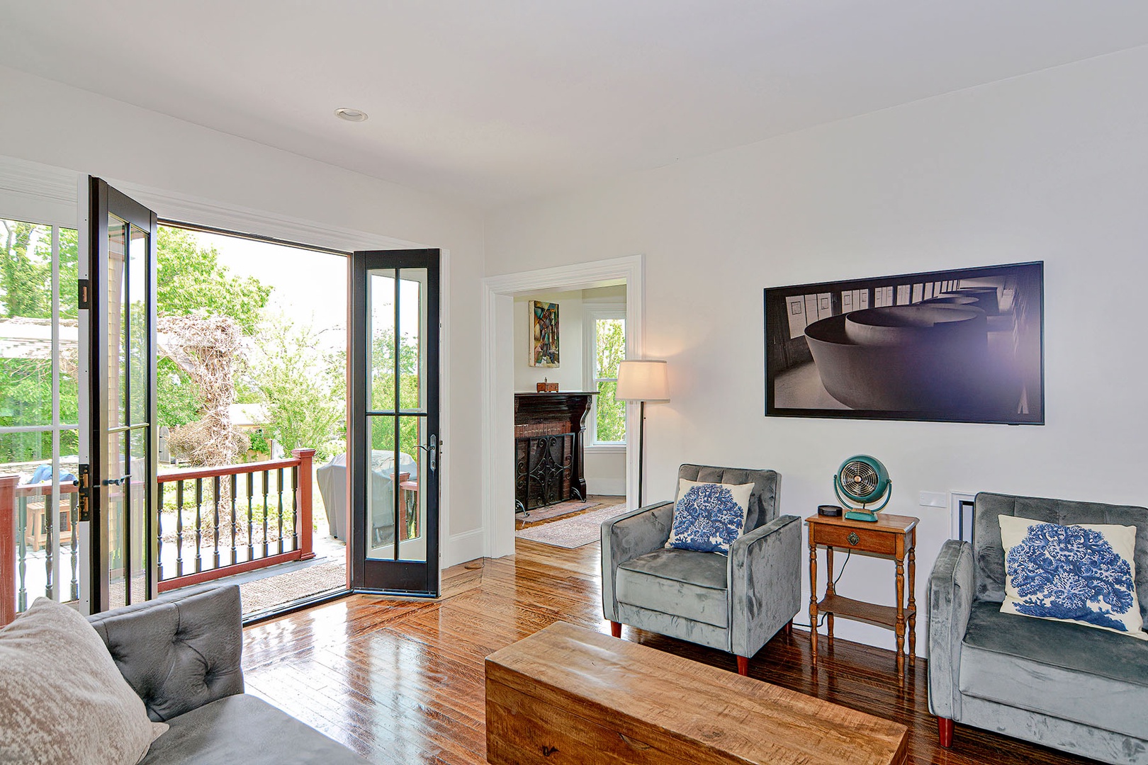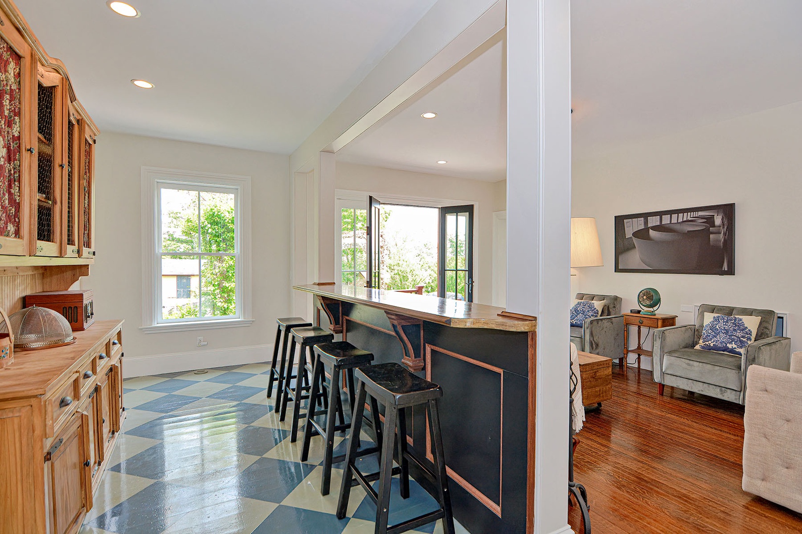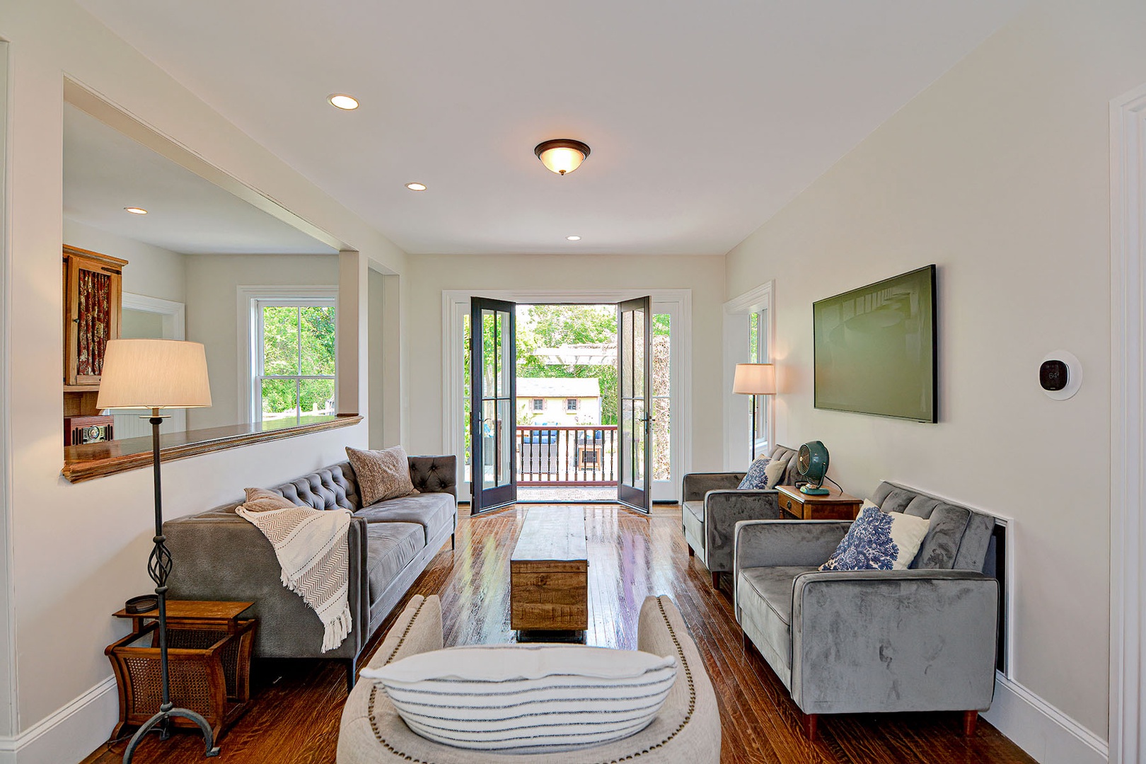 Bright living room, open to the dining room and kitchen, with french doors out to the patio.