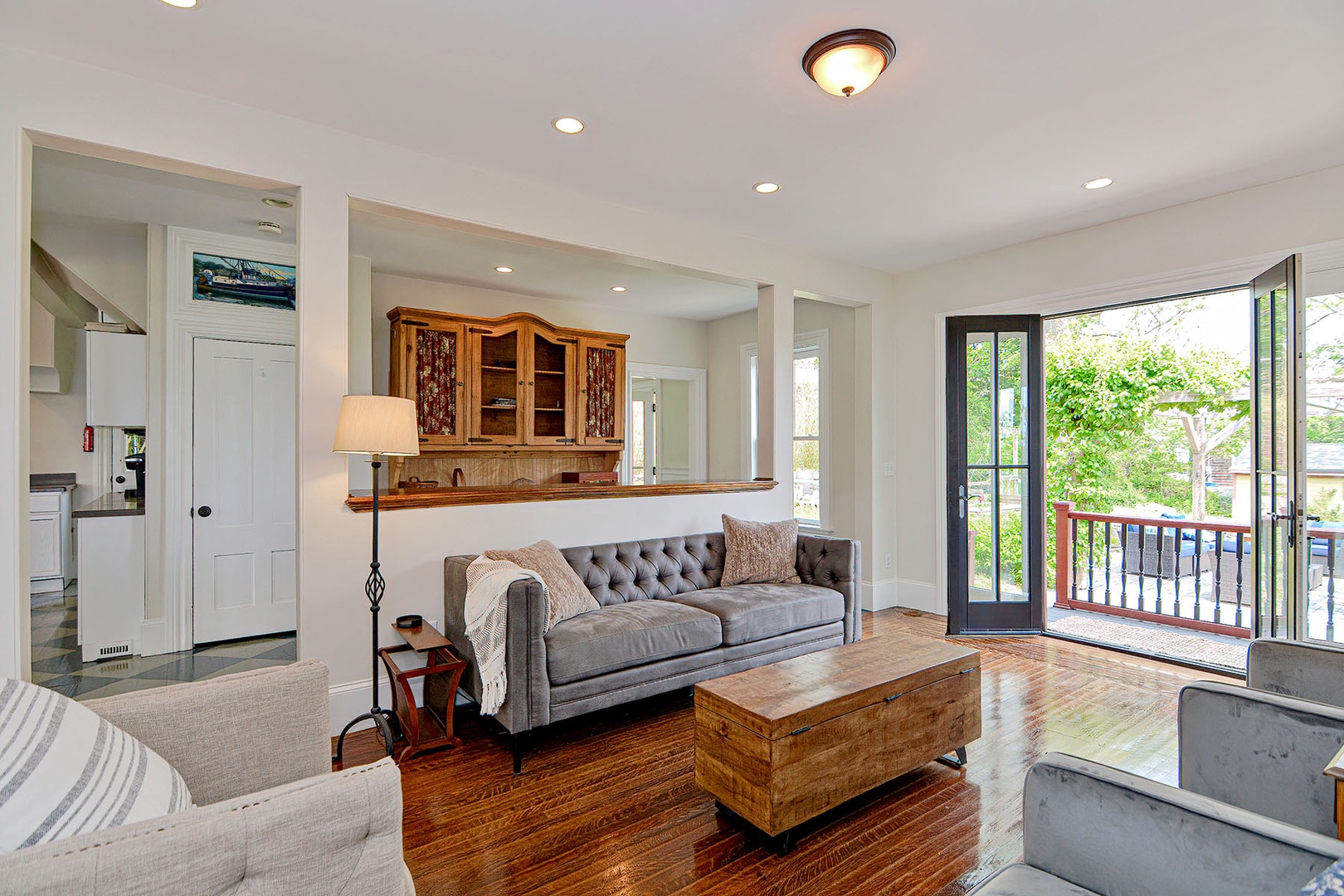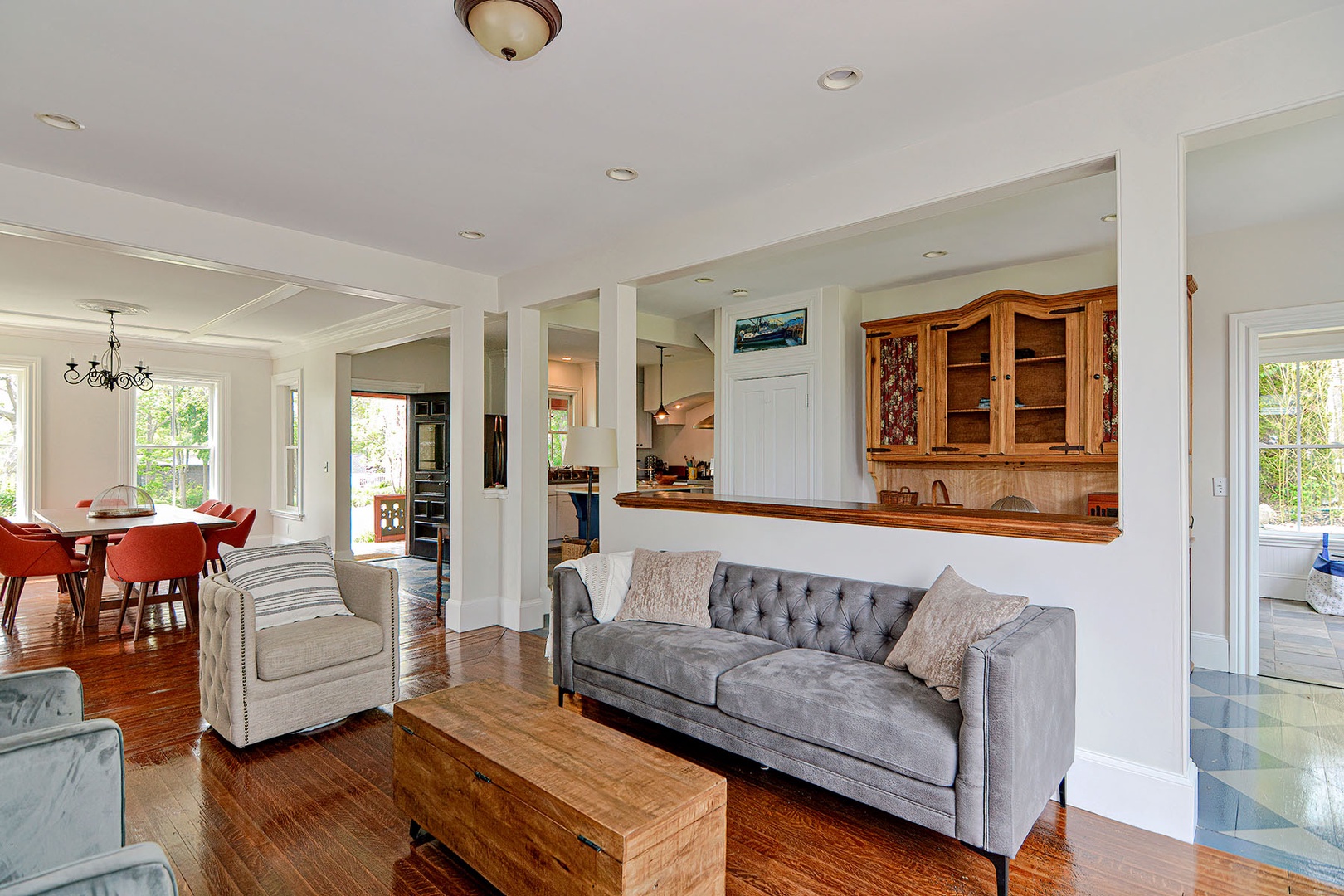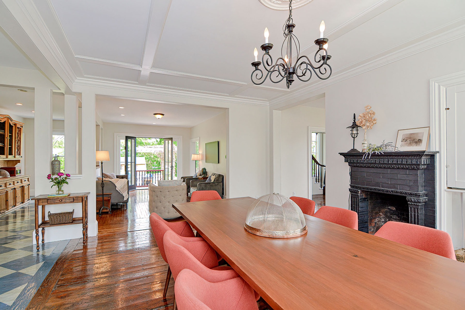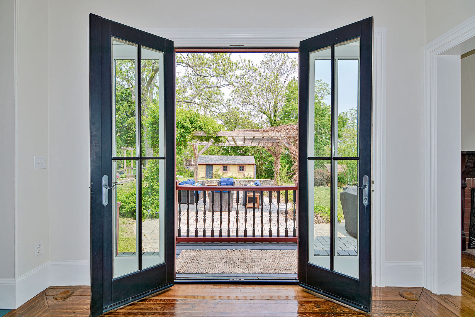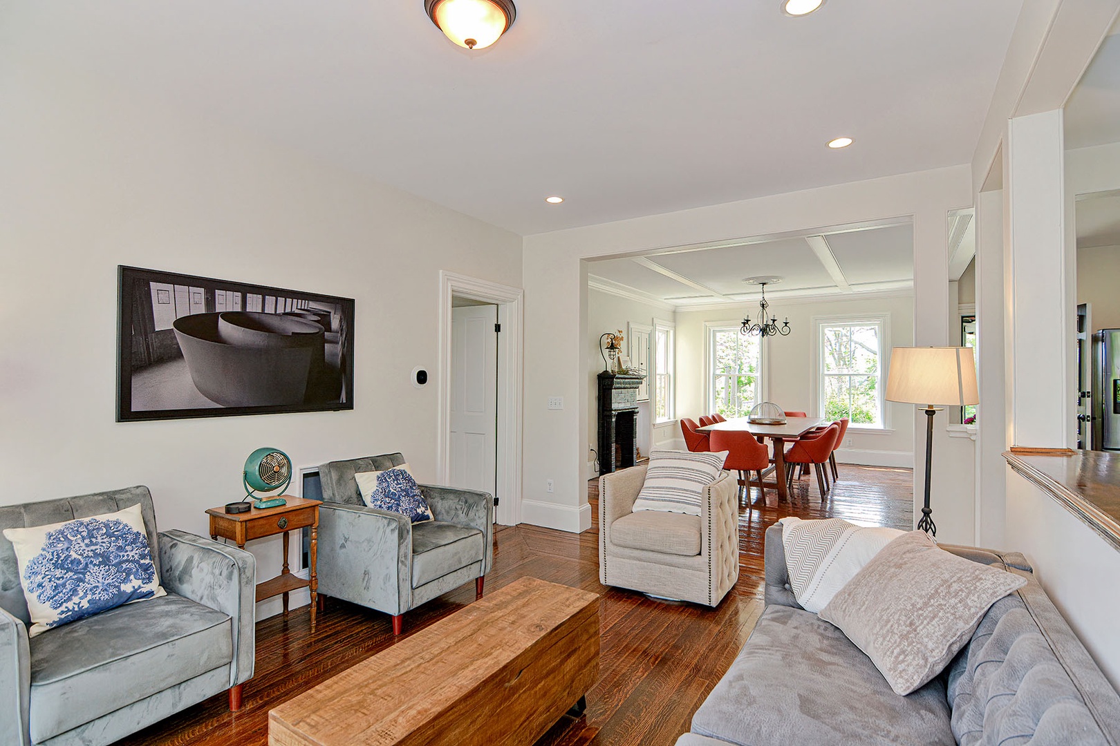 Bright living room, open to the dining room and kitchen, with french doors out to the patio.
